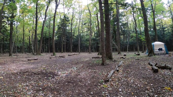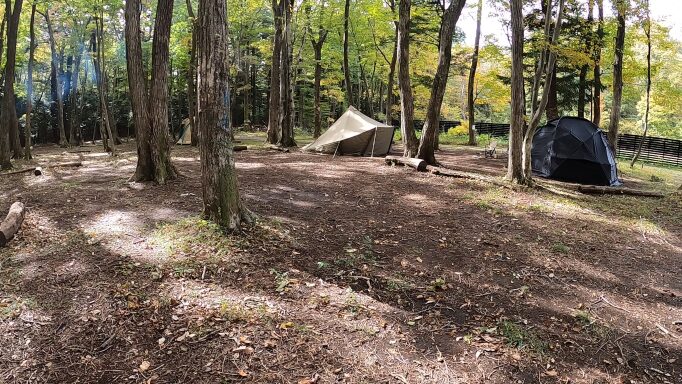 まさに森林浴といった景観のキャンプ場で、車の走行音も少なく、静かに焚火が楽しめる環境です