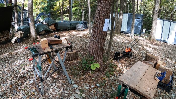 薪をサイトへ持っていくための袋やリヤカーなども置いてあるため、これもかなり便利だと感じました